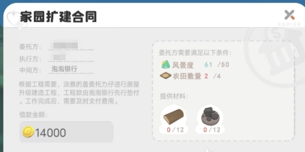 6、在我们点完扩建之后,茉莉会给我们一份家园扩建合同,我们需要攒齐合同上的材料才能进行扩建。