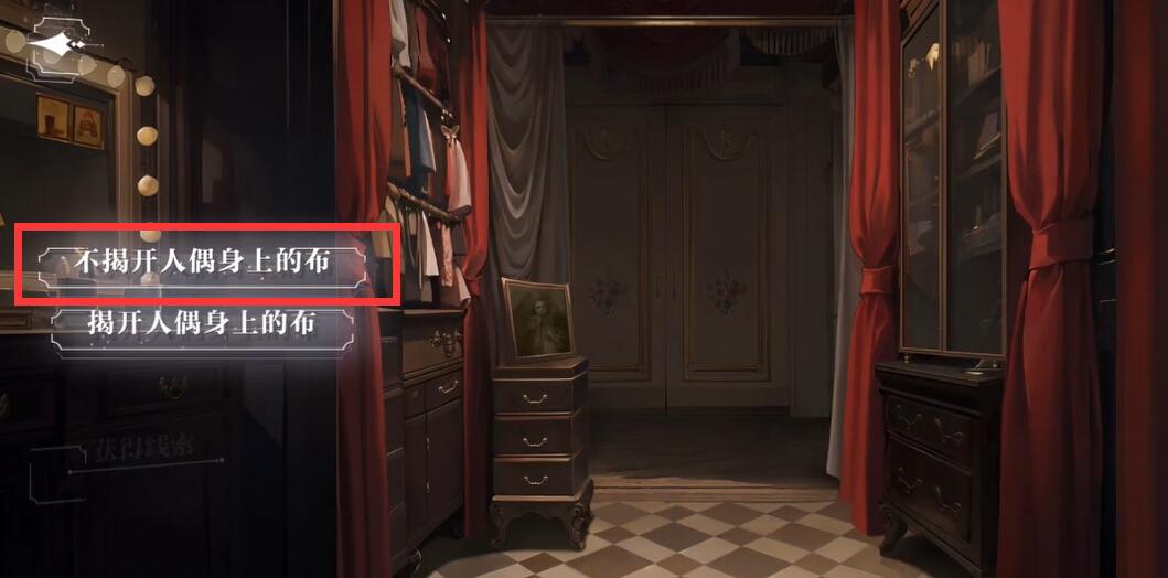 1、房间一、二不变,进入房间三。调查所有线索,再点击调查左侧桌子。选择【不揭开人偶身上的布】。