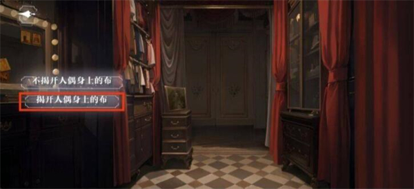 1、房间一、二不变,在房间三调查线索,选择【揭开人偶身上的布】。