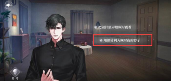 1、房间二获得银针,点击左下思考得结论【顾时夜对我别有所图?】。