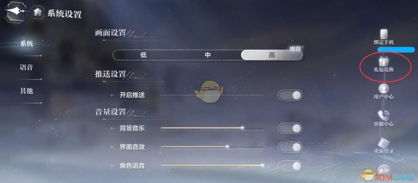 3、进入设置功能页后,选择右侧的礼包兑换选项。