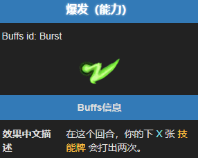 在效果机制方面,当玩家拥有爆发状态时,本回合内接下来打出的 X 张技能牌会打出两次。这是一种计数状态,层数代表能触发双倍效果的技能牌数量。需要注意的是,爆发效果只在本回合生效,回合结束后会自动消失。对于同一张技能牌,双倍打出意味着其效果会触发两次,从而产生巨大的战术价值。
