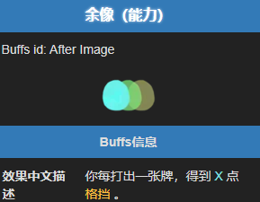 关于杀戮尖塔 2 余像能力的具体效果,其状态效果描述十分直观。中文描述为“你每打出一张牌,得到 X 点格挡”,英文描述则为"Whenever you play a card, gain X Block"。这一效果属于玩家 BUFF,来源唯一且支持叠加。这意味着层数越高,每张牌提供的格挡数值就越多,是静默猎手核心防御机制之一,尤其适合高频出牌的构筑思路。
