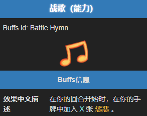 该状态类型归类为玩家 BUFF,来源唯一且支持可叠加。在效果机制方面,拥有战歌状态时,每回合开始时,手牌中加入 X 张惩恶牌。该效果可叠加,层数越高,每回合获得的惩恶越多。惩恶牌是观者的专属卡牌,通常为 0 费,造成一定伤害。
