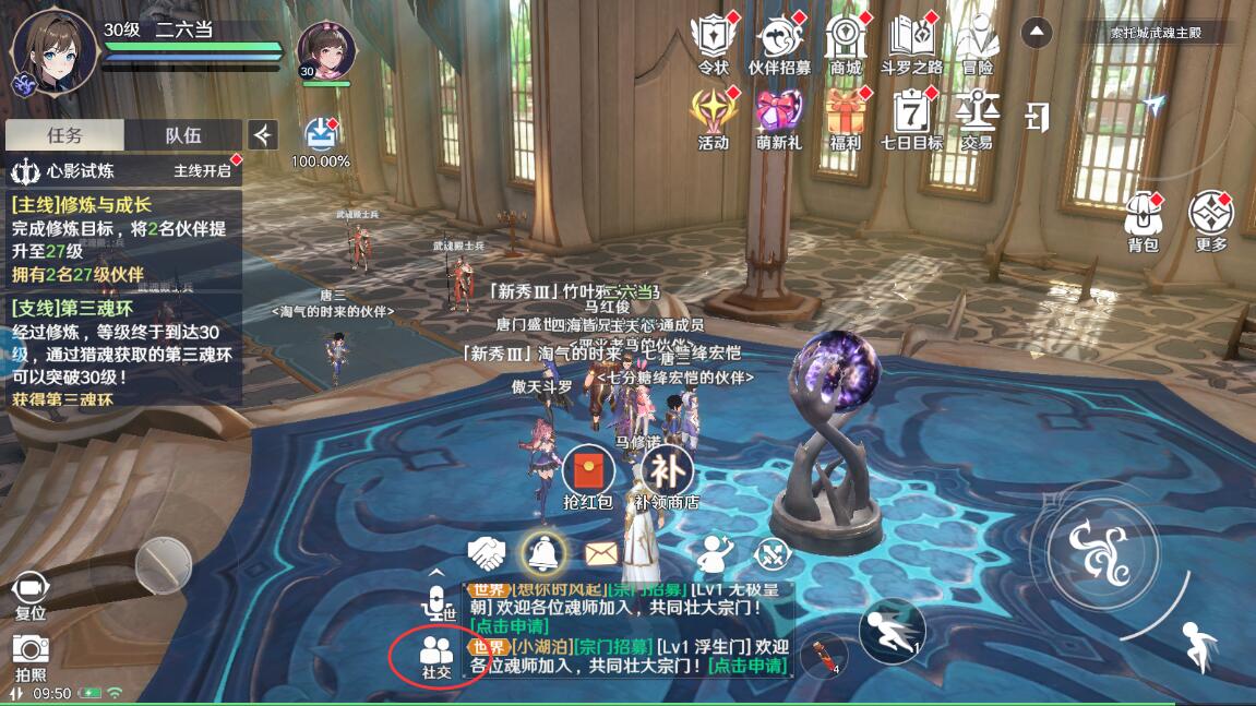 1、在斗罗大陆史莱克学院游戏主界面点击下方的“社交”图标