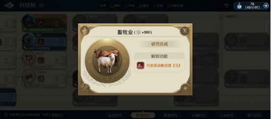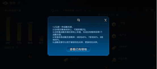 以战略资源“马”为例,玩家需要先从科技树中解锁“畜牧业”才能解锁“马”,但“马”只有在6级以上的粮食地才有,还要通过军垦才能稳定获取“马”。