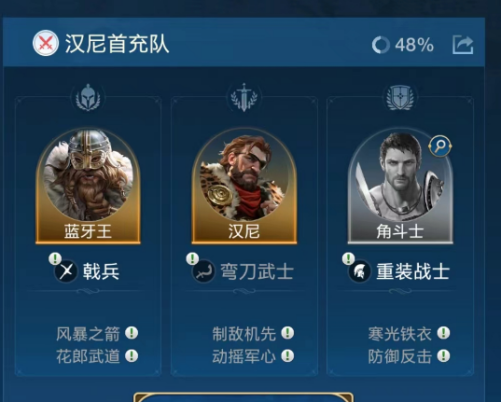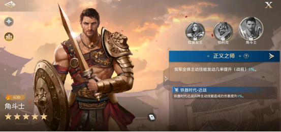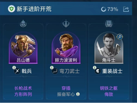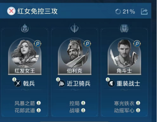 兵种和技能搭配上,伯利克搭配机动性强的骑兵单位,技能携带“控局”“战壕”;角斗士是前排承伤位,兵种需要一定防御能力,类似“重装战士”一类的高防兵种,技能携带“寒光铁衣”、“动摇军心”类的输出或者控场技能;红发女王以输出为主,携带高攻兵种,技能带“风暴之箭”“花郎武道”的输出技能。