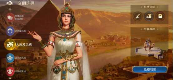 古埃及文明的文明特性是战斗后部队立刻恢复3%损失兵力,由于恢复值是按已损失兵力来计算,3%偏低了些,实际使用中只有连续作战可以发挥一定的价值,属于需要开发新玩法的文明特性。