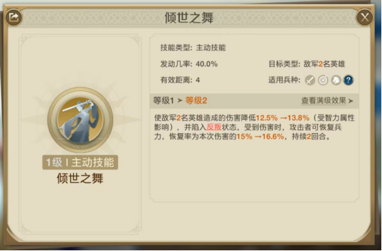 技能是虞美人的亮点所在,一技能使敌军2名英雄造成的伤害降低,并陷入反叛状态,受到伤害时,攻击者可以恢复一定的兵力。这个技能通俗点来说就是先给对方上个降攻debuff,再上个反叛debuff,我方友军攻击这个反叛debuff的敌人会按伤害量恢复一定兵力。这个技能让虞美人可以塞进任何需要续航恢复的队伍,能保证全队的存活率和战损率,弥补了属性上的不足。