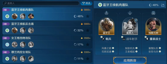最适合虞美人的就是续航队或者肉队,比较推荐的一套阵容是“蓝牙王+虞美人+独眼元帅”,门槛低,蓝牙王与独眼元帅都是签到英雄,这个队伍依靠蓝牙王的追击伤害和独眼元帅的坦度来折磨对方,再搭配虞美人强势的续航恢复效果,长线作战非常给力。如果是首充玩家,独眼元帅也可以换成角斗士,角斗士的属性叠层更快更稳,这个队伍输出也更上一层台阶。
