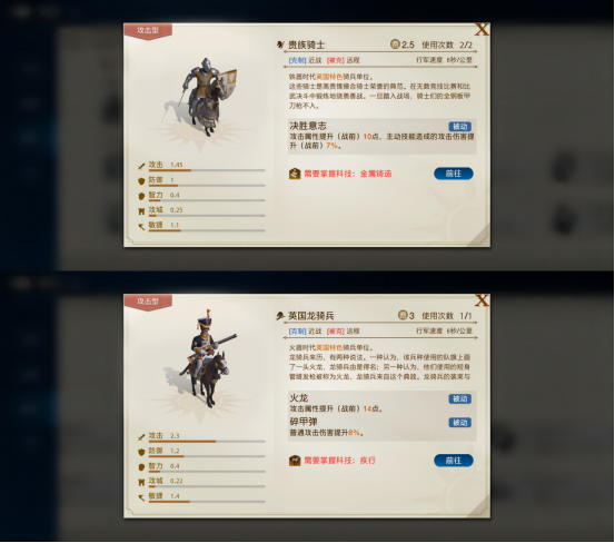 2、火器时代英国龙骑兵,攻击型兵种,技能在提升攻击属性的同时,还可以加强普攻伤害。