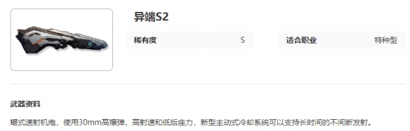 《艾塔纪元》异端S2图鉴介绍蝎式速射机炮,使用30mm高爆弹,高射速和低后座力,新型主动式冷却系统可以支持长时间的不间断发射的武器,下面小编给大家带来艾塔纪元异端S2图鉴介绍,有需要的小伙伴一起来看看吧。