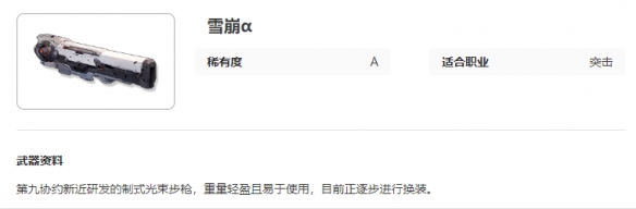 《艾塔纪元》雪崩α图鉴介绍,第九协约新近研发的制式光束步枪,重量轻盈且易于使用,目前正逐步进行换装。下面小编给大家带来艾塔纪元雪崩α图鉴介绍,有需要的小伙伴一起来看看吧。