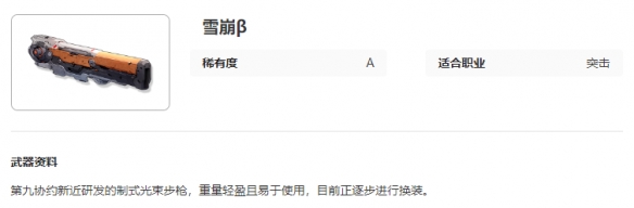 《艾塔纪元》雪崩β图鉴介绍,第九协约新近研发的制式光束步枪,重量轻盈且易于使用,目前正逐步进行换装。下面小编给大家带来艾塔纪元雪崩β图鉴介绍,有需要的小伙伴一起来看看吧。