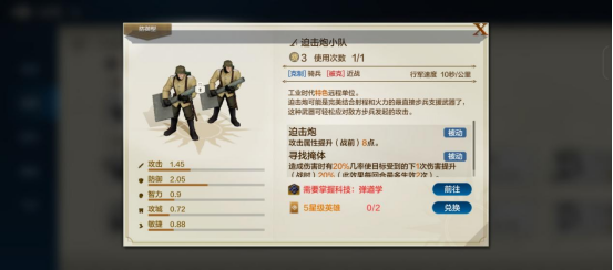 被动:迫击炮(攻击属性提升(战前)8点)、寻找掩体(造成伤害时有20%几率使目标受到的下1次伤害提升(战时)20%,此效果每回合最多生效2次)