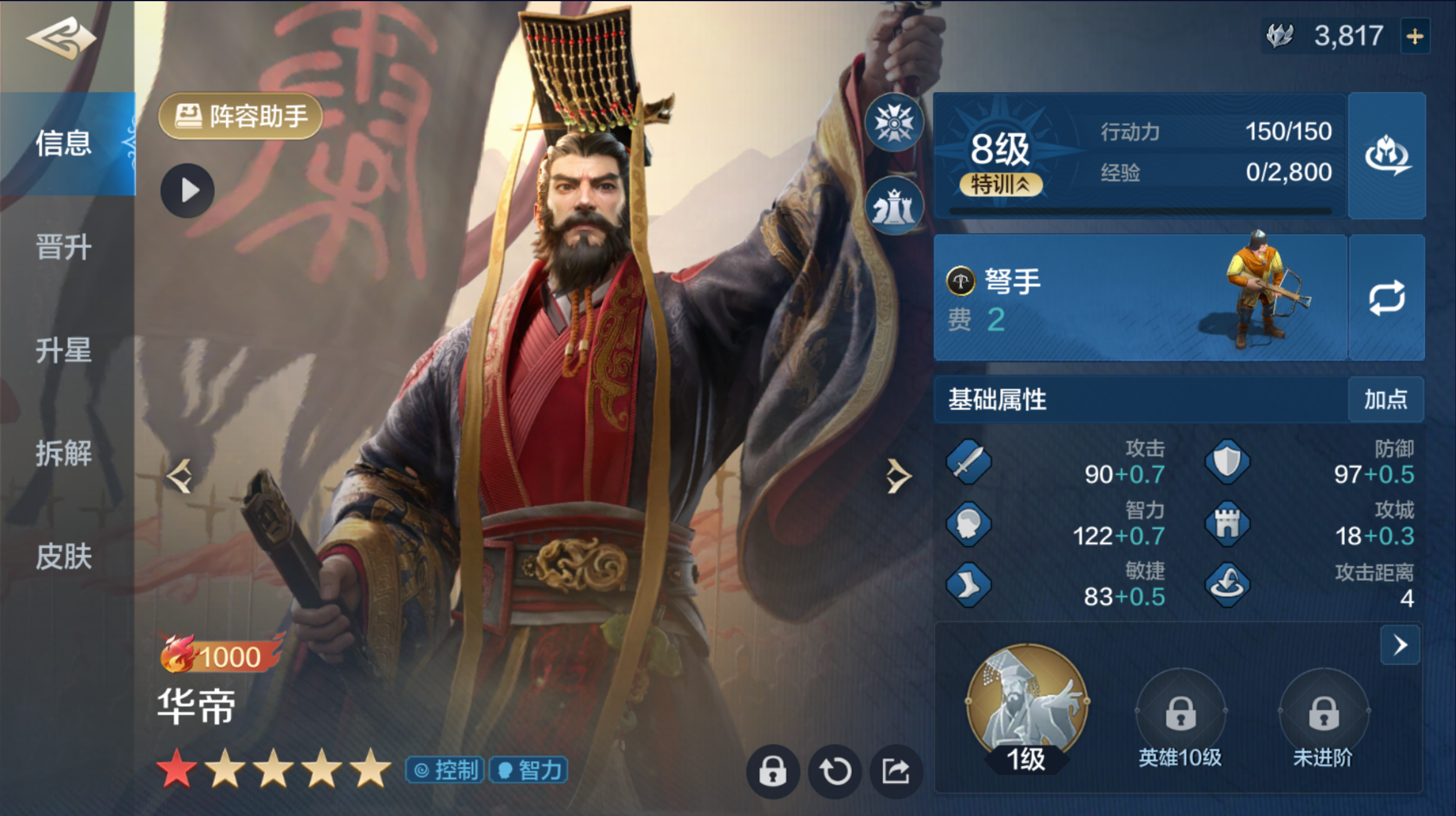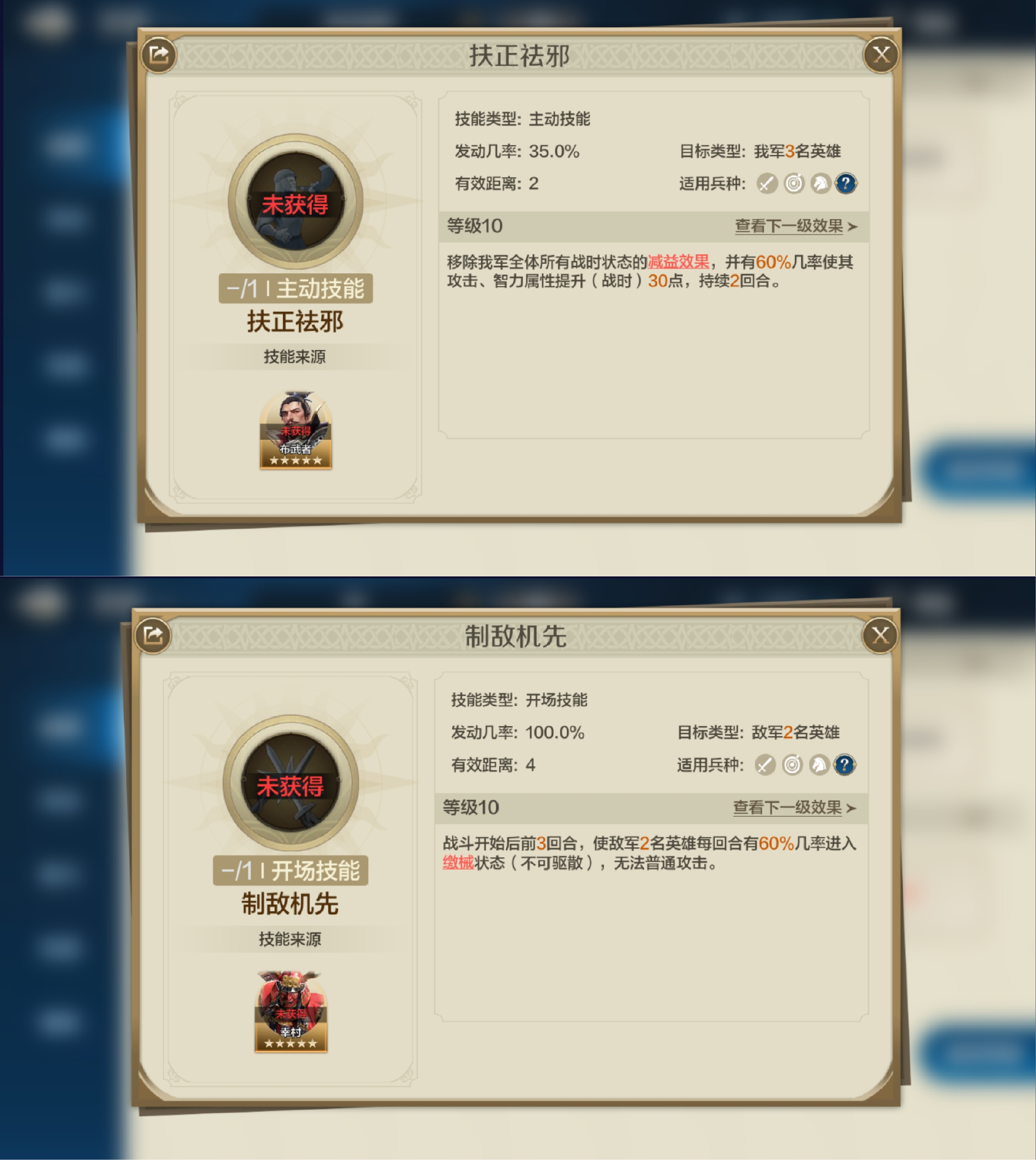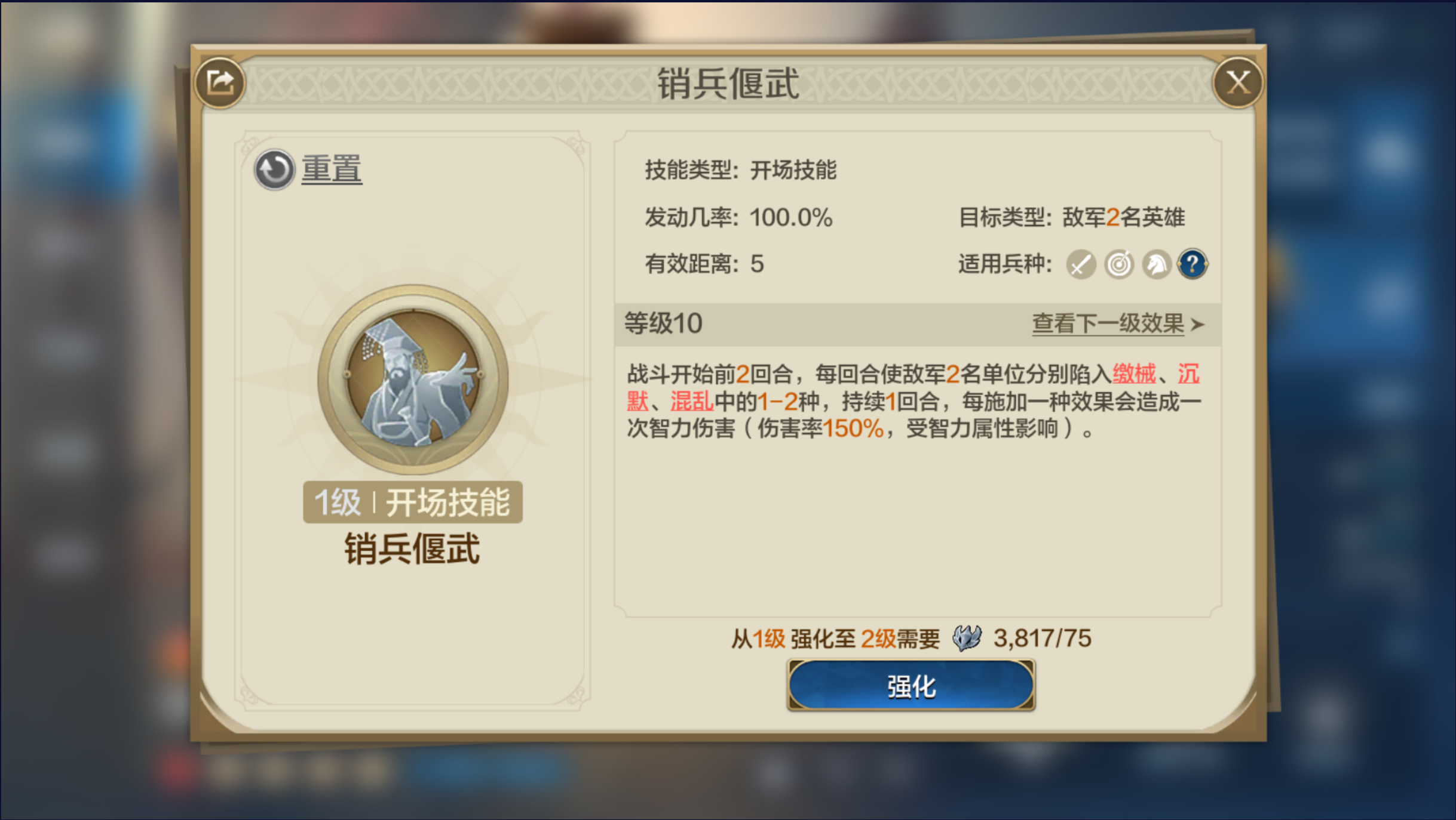 自带技能;【销兵偃武】;战斗初始两回合,能使敌军两名单位陷入缴械、沉默或混乱状态,每次施加效果时还会根据智力属性造成75%至150%的智力伤害。