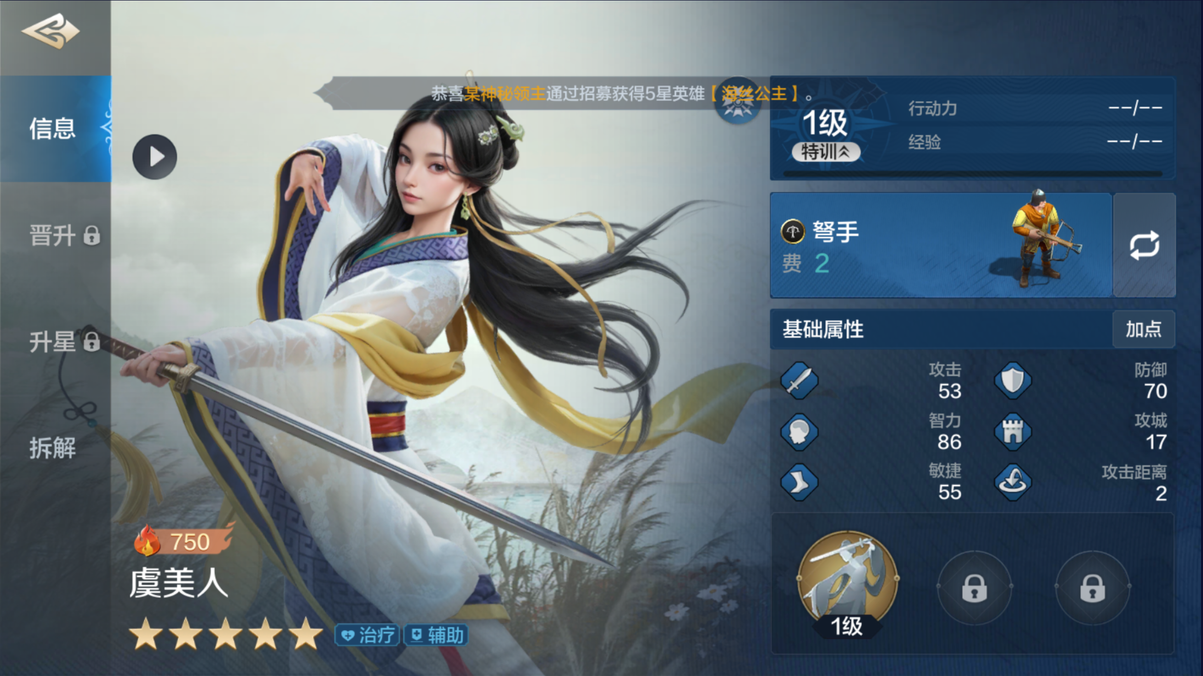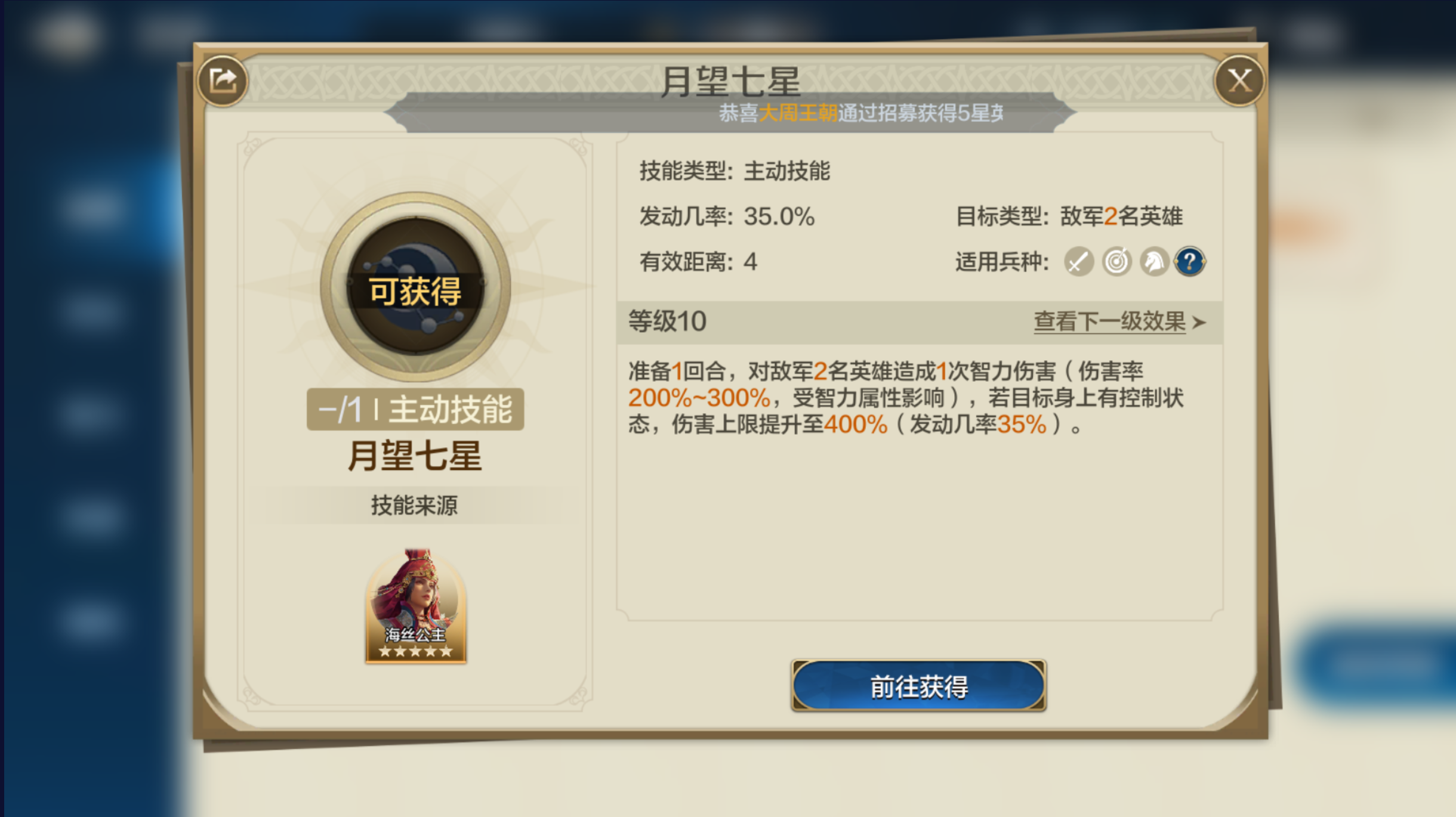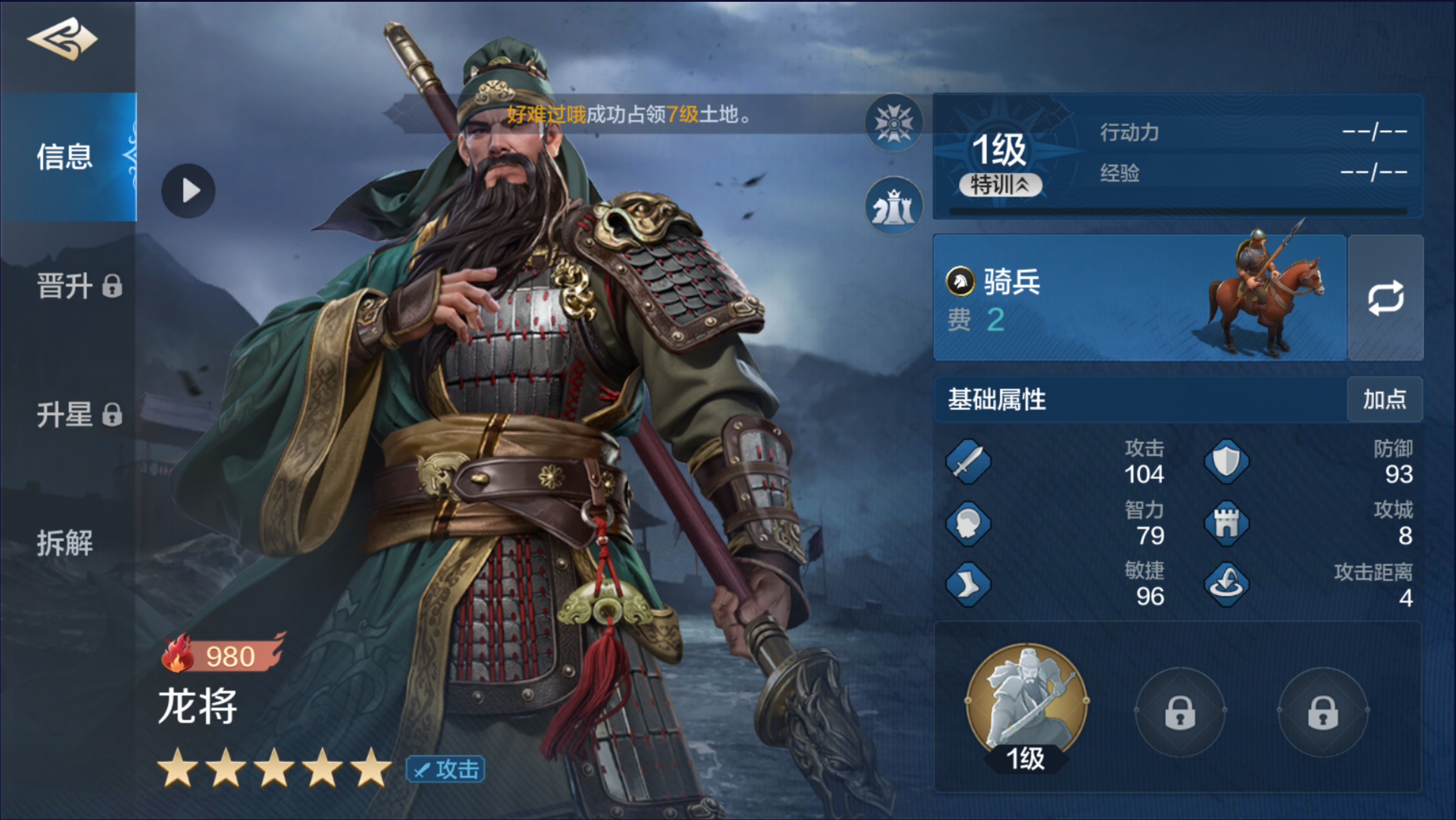自带技能;【销兵偃武】;战斗初始两回合,能使敌军两名单位陷入缴械、沉默或混乱状态,每次施加效果时还会根据智力属性造成75%至150%的智力伤害。