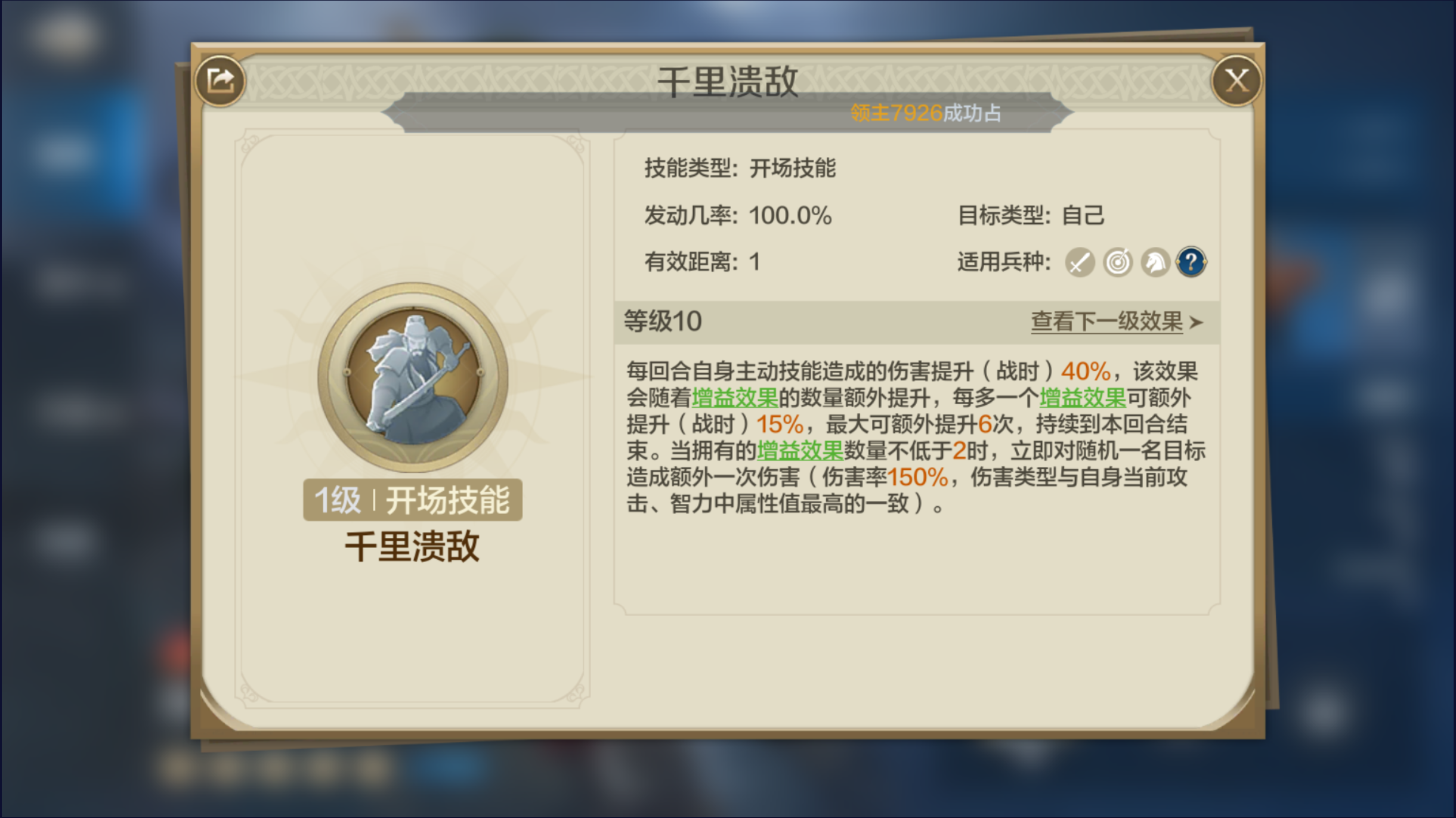 自带技能;【千里溃提】:主动技能首伤每回合提升20%-40%,增益效果可额外增加伤害(每个+7.5%-15%,最多6次)。增益达2个及以上时,对随机目标造成75%-150%的额外属性伤害。