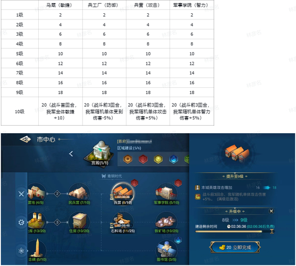 1.建筑加成由马厩、兵工厂、兵营,军事学院等建筑构成,能够为本城英雄出战时提升面板属性。并在建筑满级提供额外效果。