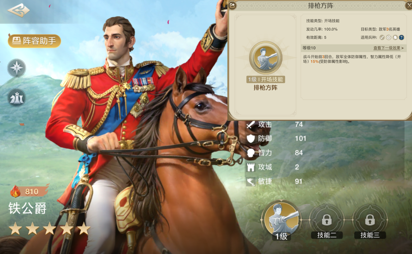 与两位女王搭配的第三个英雄,我这里推荐的是铁公爵。三狮女王的技能核心是利用前四回合打出高额输出,而且斯基泰女王和三狮女王的身板都比较脆,所以前排即要补一个肉盾控制,又要能在前几个回合起到作用的,我这里思来想去就只想到铁公爵了。铁公爵的技能能够在开场降低敌方的防御和智力属性,进一步提升我方的输出。同时铁公爵还拥有着高达101的防御属性,非常能抗伤。