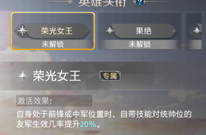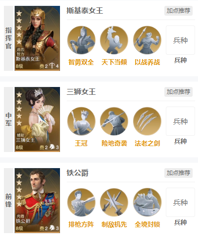 斯基泰女王和三狮女王唯一的缺点就是三狮女王的技能不一定能稳定给得到斯基泰女王。所以最好解锁三狮女王的专属头衔“荣光女王”,能够提升技能对统帅位的发动几率。