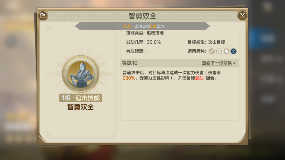 当加冕升级到满级之后,前三回合的追击概率达到了100%,于是在前三回合就可以普攻三次,挂三次混乱。这时候再捎上一个力之汲取,普攻后再造成一次攻击,并吸取对面攻、智各二十点。因为能普攻三次的缘故,她在前三回合的每一回合都有概率吸三次。