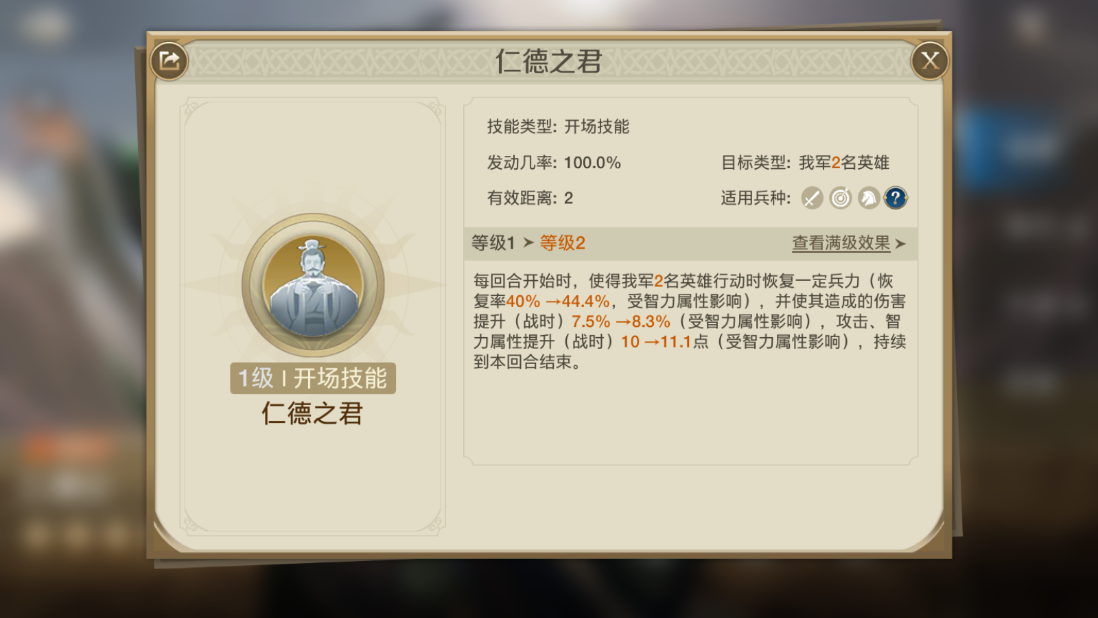 仁德公的技能——仁德之君,能在回合开始时让我方的两个英雄恢复一定的兵力,并且使其造成的伤害、智力、攻击均提高,持续到本回合结束!