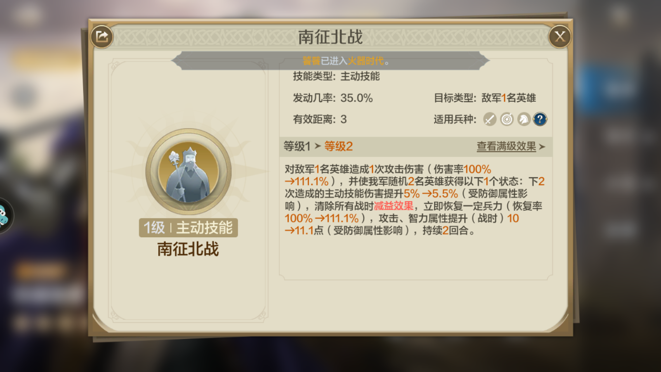 铁锤查理的技能——南征北战,不仅能对敌方造成一次伤害,并且还能让我军的随机两名英雄从:下两次造成的主动技能伤害提升、清楚所有战时减益状态、立即回复一定兵力、攻击以及智力属性提升,这些状态中随机获取一个!持续两回合。
