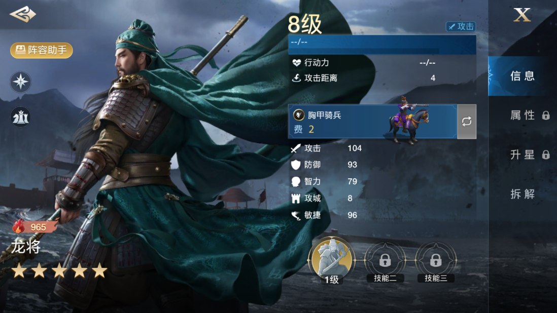 首先我们来看看这套阵容的核心输出点——龙将,高达104的初始攻击属性以及同样不菲的防御、智力以及敏捷属性,毫无疑问让龙将成为一个非常理想的主输出英雄,可以出色的担任队伍的主输出角色。