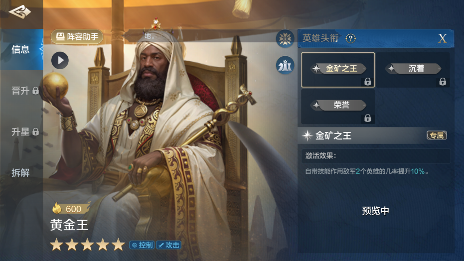 如果真决定使用他,那么他的专属头衔还是很有必要的,金矿之王能够使他自带技能作用敌军2个英进的几率提升10%,运气好的话这个给对面两人挂力竭的收益是非常高的。