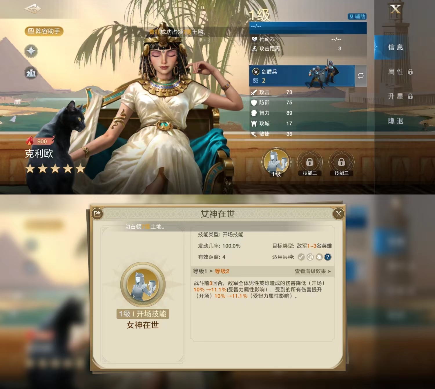 技能为【女神在世】,开场技能,距离4,100%发动,三回合内让对面所有男人输出降低和受到伤害增加。稳定的开场技能,但缺点只能对男人生效,有点遗憾。