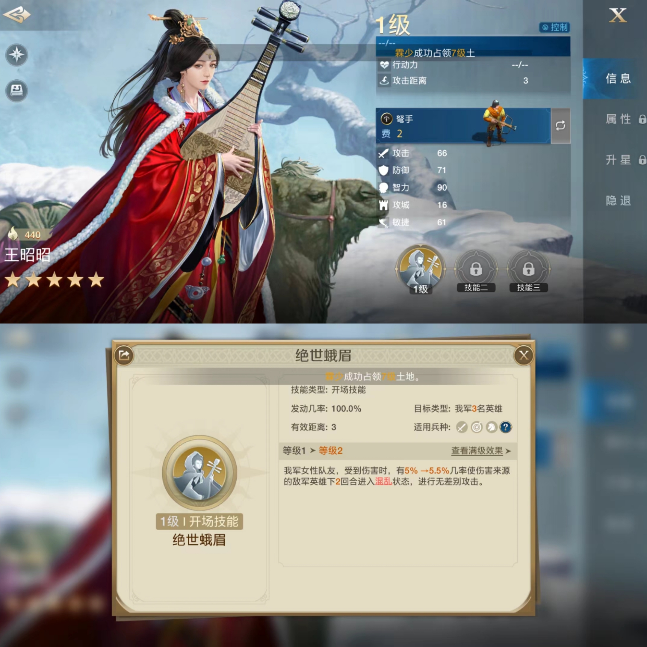 技能为【绝世蛾眉】,开场技能,距离3,发动距离100%,我方女性队友被动挨打会触发对方混乱,几率很小,算是个被动技能。