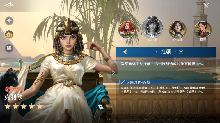 克利欧的另一个羁绊红颜对查尔曼、龙将等主动输出英雄的反制更大,红颜能够使敌军全体主动技能、追击技能造成的伤害降低20%。