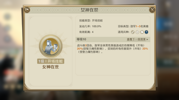 而她的自带技能也是next level,前三回合敌方男性降伤20%,受伤增加20%,自带青春版的动于九天+迁延战术,确实对得起“女神在世”这个名字。