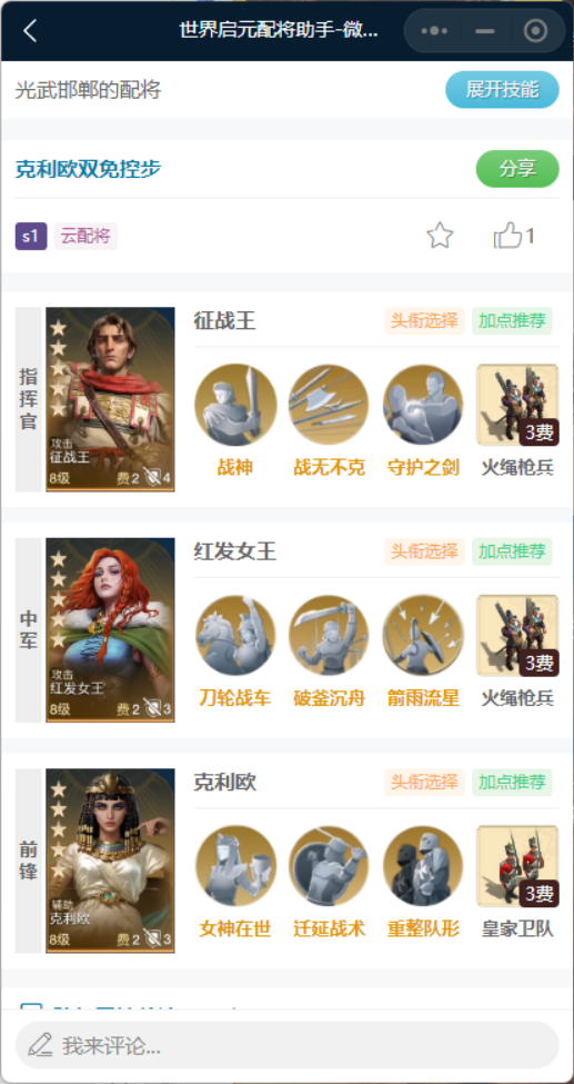 克利欧也可以单拆出来和华帝、查尔曼组成一个法系阵容,适合一统天下和乔瓦娜体系两边都凑不齐时,三人凑合一下搭伙过日子。思路是克利欧当辅助,华帝当控制,查尔曼输出。克利欧可以带动于九天+整军经武。动于九天是我军两人增伤30%,整军经武是一个前两回合的奶,保护队友不一上场就暴毙。华帝则可以带动摇军心+攻心为上,主打一个将对面控到死,而查尔曼可以带月望七星+神机妙算/火攻,或是在带有控制的情况下将输出打满,或是配合自己的主动技打输出。这里的华帝也可以换成波拿巴。