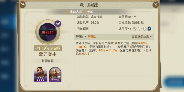 前期带弯刀突击,在普攻后,对目标造成1次智力伤害(伤害率90%-100%),并使目标下1回合受到智力伤害提升10%-11.1%。