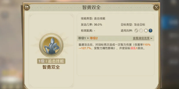 2技能前期我们用运筹来过渡,也是1个单体伤害(伤害率70%-77.7%,还能使得敌方敏捷属性降低5-5.5点)持续1回合。不错的单体技能,还能降低属性。