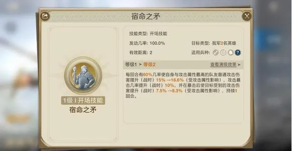 每回合有60%的概率,使自身与一名攻击最高的队友普通攻击伤害提升最高30%,并在暴击后使目标受到的攻击伤害提升最高15%,并持续一回合。(均为战时属性,并受弗雷德里克攻击属性影响可突破最高上限)