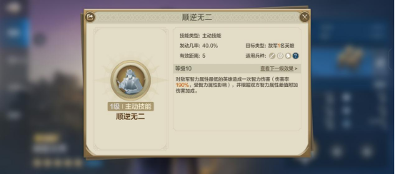 变生肘腋:战斗中敌军统帅英雄智力属性降低(战前)15点(进阶额外效果:自带技能发动几率提升(战前)4点)