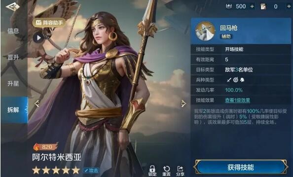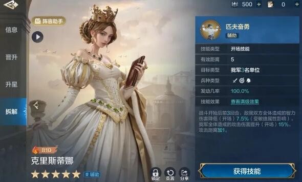 战斗开始后前3回合,敌我双方全体造成的智力伤害降低(开场)7.5%-15%(受敏捷属性影响),我军全体造成的攻击伤害提升(开场)15%-30%,攻击距离加1。