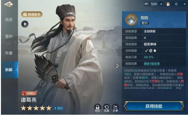 对敌军2名英雄造成1次智力伤害(伤害率40%-70%,受智力属性影响),并使目标进入灼烧状态(伤害率40%-80%,受智力属性影响),持续2回合。若目标已处于灼烧状态,则使其进入燃烧状态,持续2回合,在此期间受到智力伤害时额外再受到1次智力伤害(伤害率40%-80%,受智力属性影响),此效果最多对同一目标生效两次。