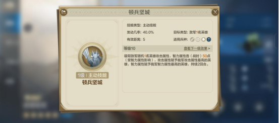 核心是其自带技能“顿兵坚城”,满级效果为: