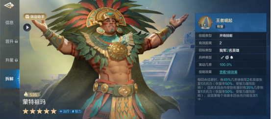技能搭配上,蒙特祖玛前期专奶,带治疗技能,后期走输出或控制,带“动摇军心”“制敌机先”等等。