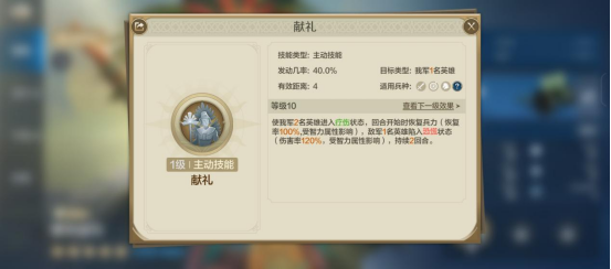 自带技能方面,“献礼”的满级效果为: