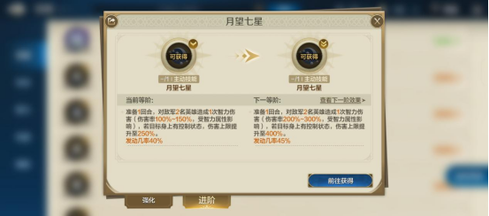同时可能因为伤害浮动,“月望七星”也有相对补偿的设计就是其在满阶后,发动几率高达45%,几率接近一半。