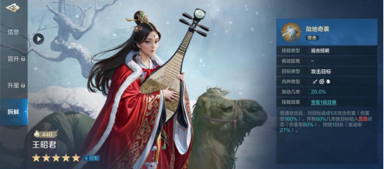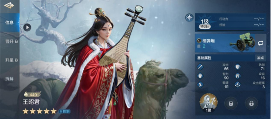 王昭君率领的兵种类型是远程,攻击距离为3,定位是控制。面板数值中下,初始智力为90,在五星英雄中不算高。