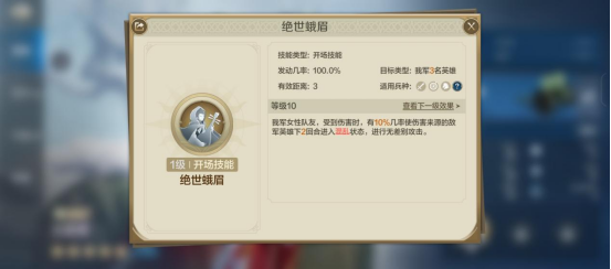 她的自带技能为“绝世蛾眉”,满级效果如下: