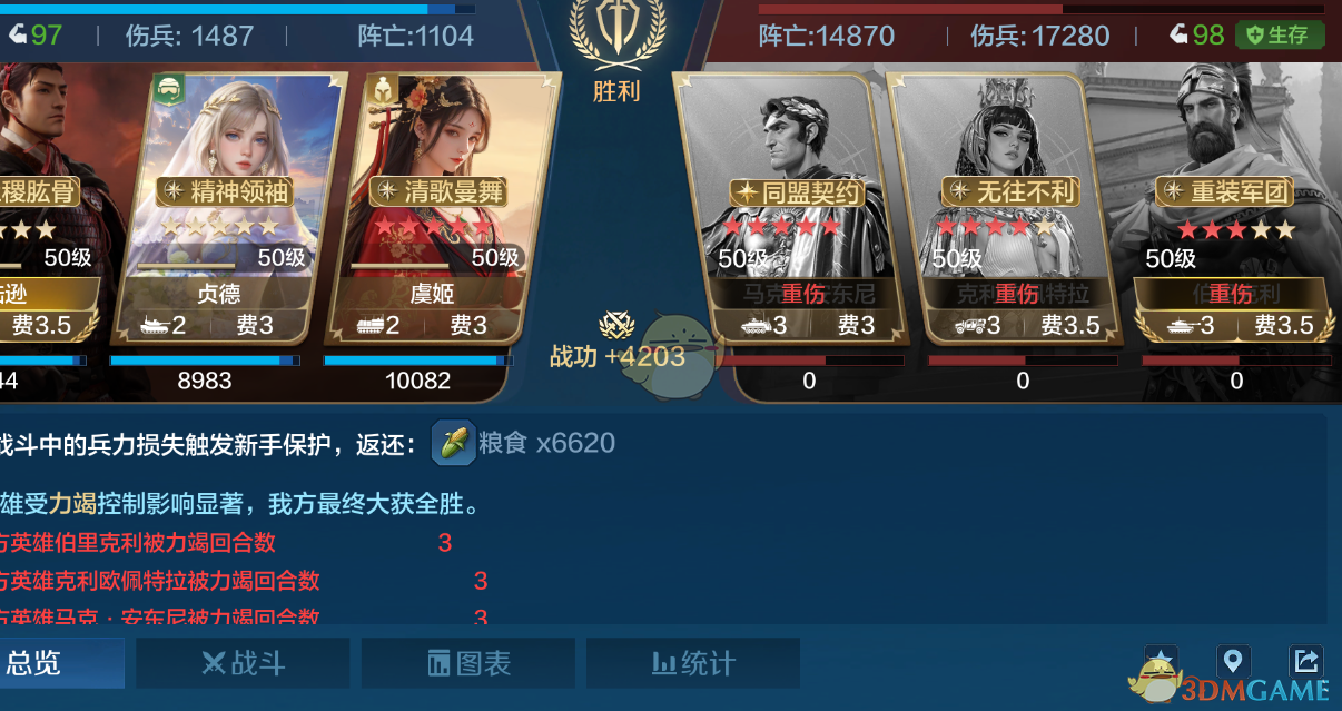 打高红反击队陆逊也是爆发非常高的伤害,锐不可当可以提供智力穿透在打这种肉队时可以更好打出伤害,而且也有着自我缴械的效果,这里扶正是第五回合才发动所以战损略高后面我多打了几次扶正只要前几回合发动了基本是无损打过反击队