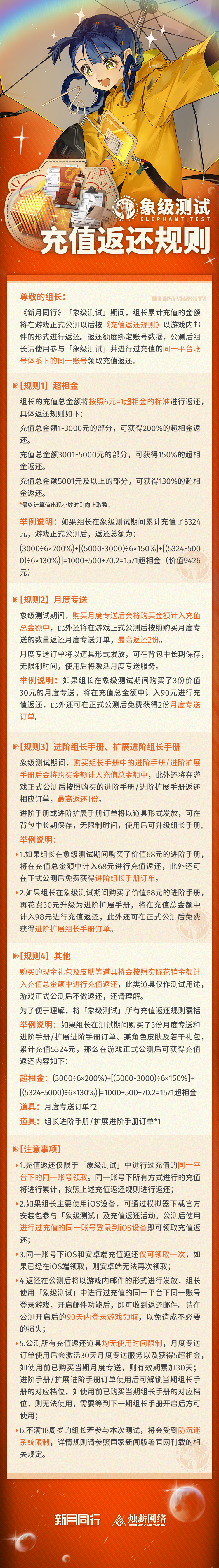 《新月同行》「 象级测试」期间,组长累计充值的金额将在游戏正式公测以后按《充值返还规则》以游戏内邮件的形式进行返还。返还额度绑定账号数据,公测后组长请使用参与「象级测试」并进行过充值的同一平台账号体系下的同一账号领取充值返还。