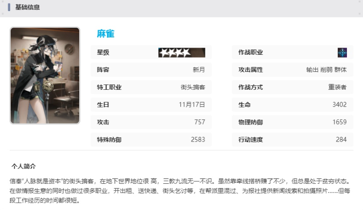 麻雀对全部可选敌人造成235.99%的特殊伤害,降低选定敌人20%攻击,效果持续2回合,并有50%概率降低剩余敌人10%攻击,效果持续2回合。